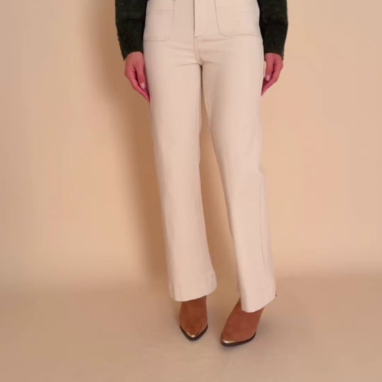 Le jean Elenette est une coupe large flare c'est à dire qu'il va suivre la cuisse (sans la coller) puis s'évaser au niveau du genou. Cette coupe reflète un style intemporel, chic et confortable.