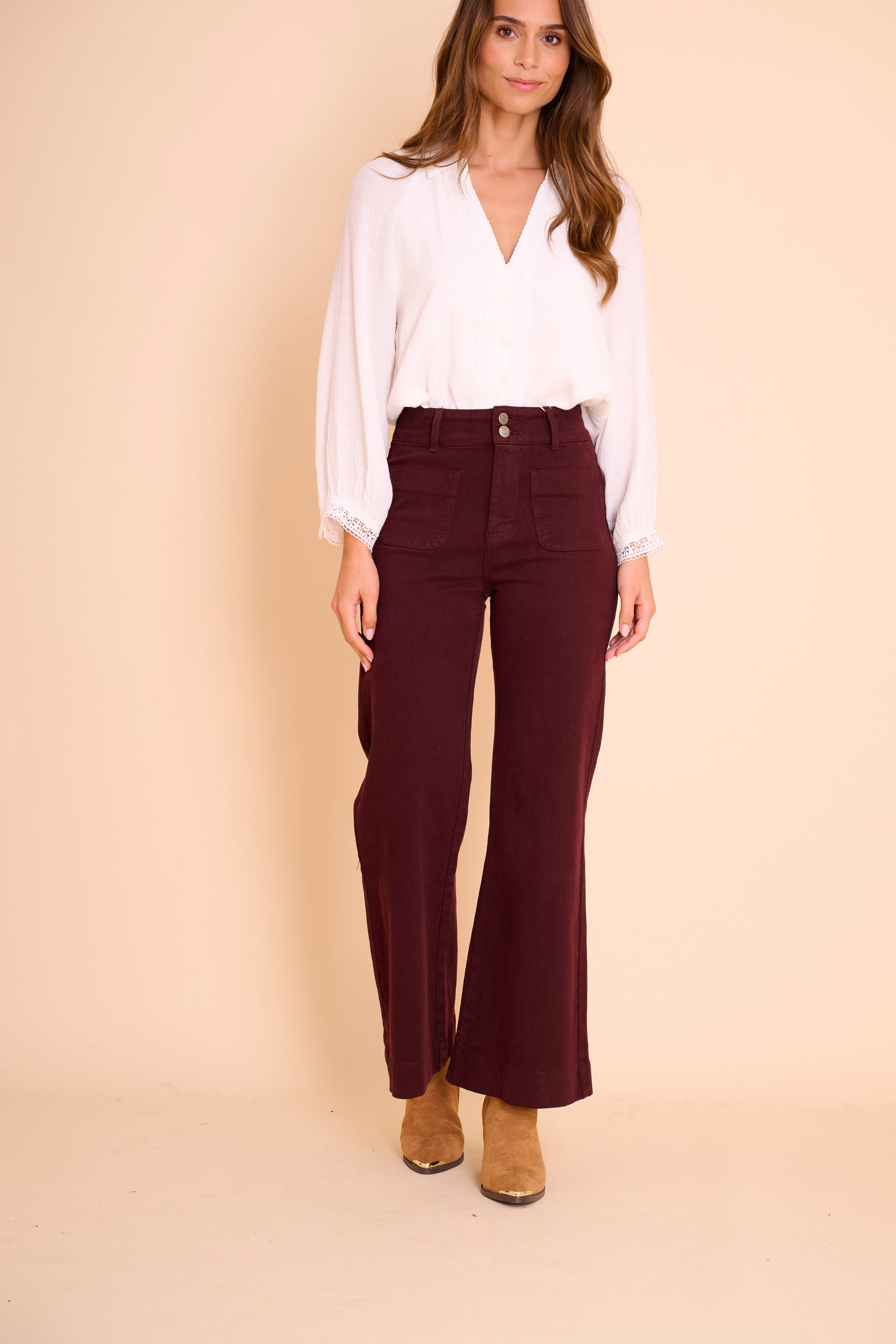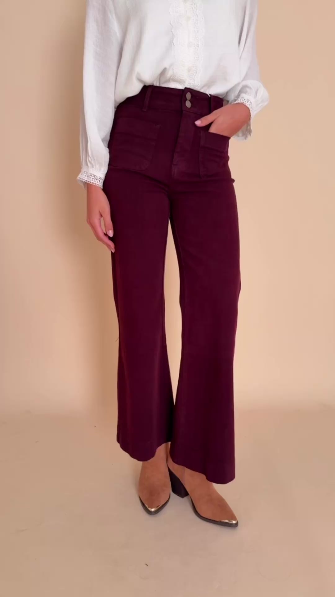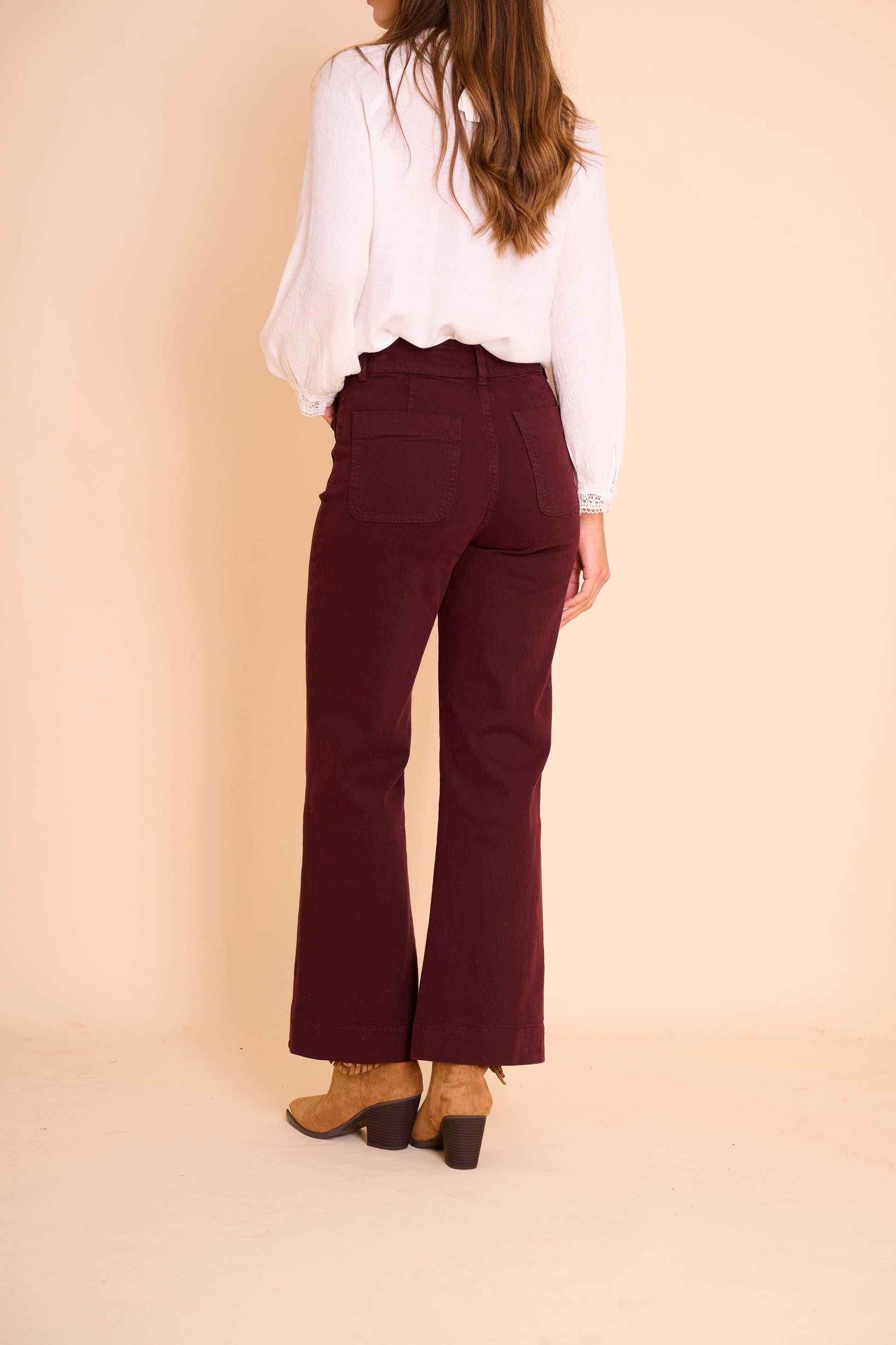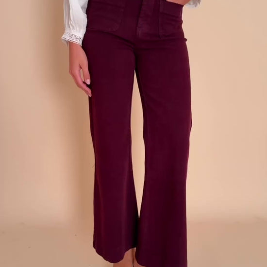 Un jean flare taille haute qui sublime toutes les silhouettes. Sa coupe épouse la cuisse sans la coller puis s’évase délicatement à partir du genou pour allonger la jambe et créer une allure élégante et féminine. Le denim bordeaux apporte une touche d’originalité chic à vos tenues du quotidien.
