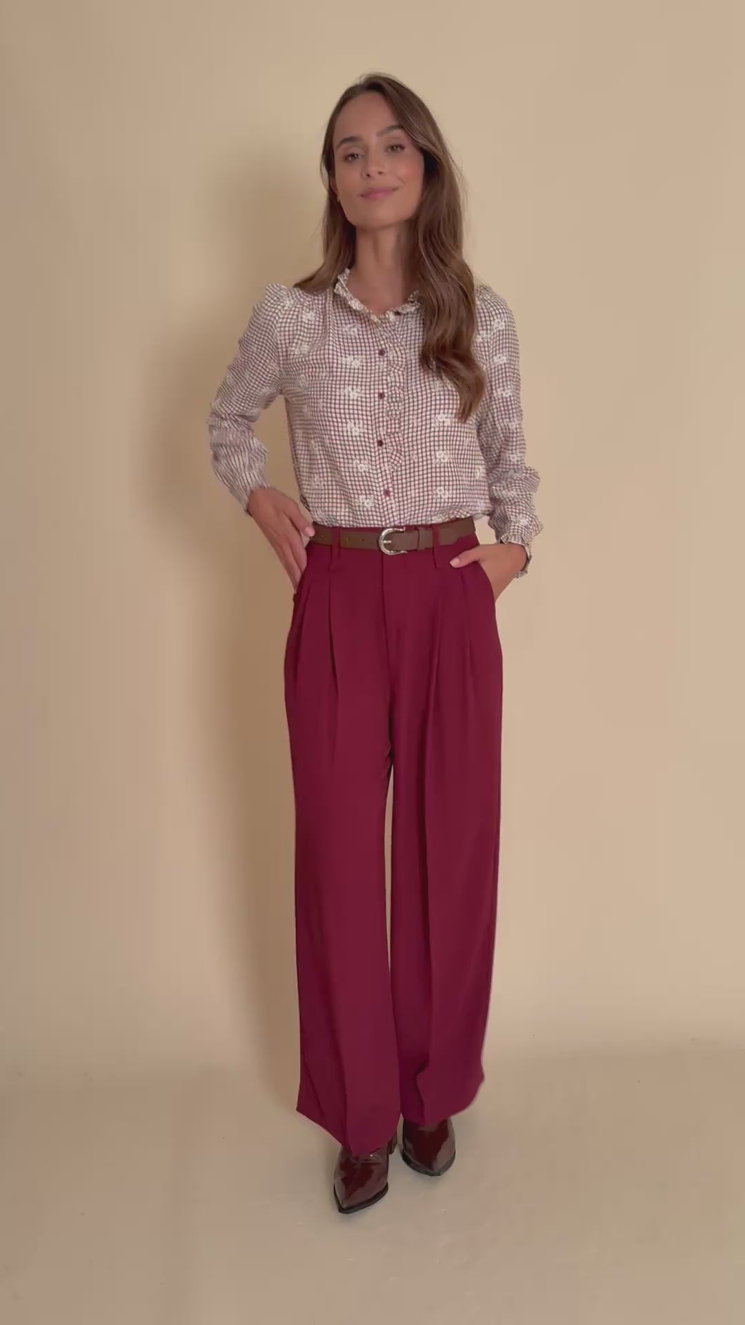 Associez le pantalon Maelia Bordeaux à une blouse écrue ou un pull ajusté pour un look chic et féminin. Pour la journée, portez-le avec des baskets blanches et une veste en jean, et le soir, misez sur des talons et une pochette pour une allure plus habillée.