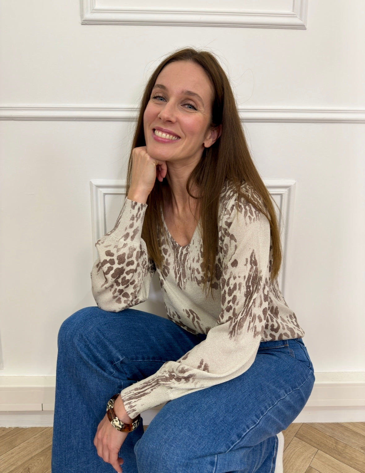 Un pull doux et lumineux qui revisite l’imprimé animal avec élégance. Sa maille légère et légèrement brillante grâce à son fil métallisé lui confère un style unique, à la fois chic et tendance.
