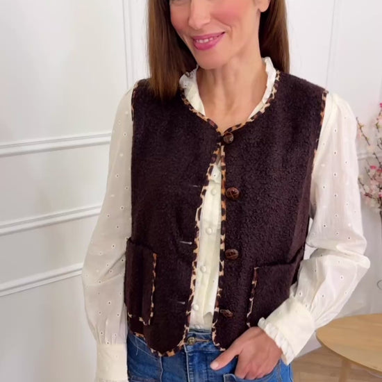 Un gilet sans manches qui allie style et confort. Avec sa texture effet mouton et ses finitions contrastées façon imprimé, il apporte une touche originale et tendance à vos tenues. Facile à superposer sur une chemise, une blouse ou un pull fin, il devient une pièce forte de votre dressing automne-hiver.