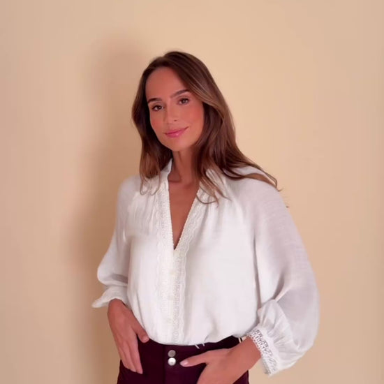 Une blouse délicate et féminine qui allie légèreté et raffinement. Son tissu fluide et sa texture douce offrent un tombé naturel, tandis que les détails ajourés sur le devant et aux poignets ajoutent une touche de charme romantique. Parfaite pour illuminer vos looks du quotidien comme vos tenues plus habillées.