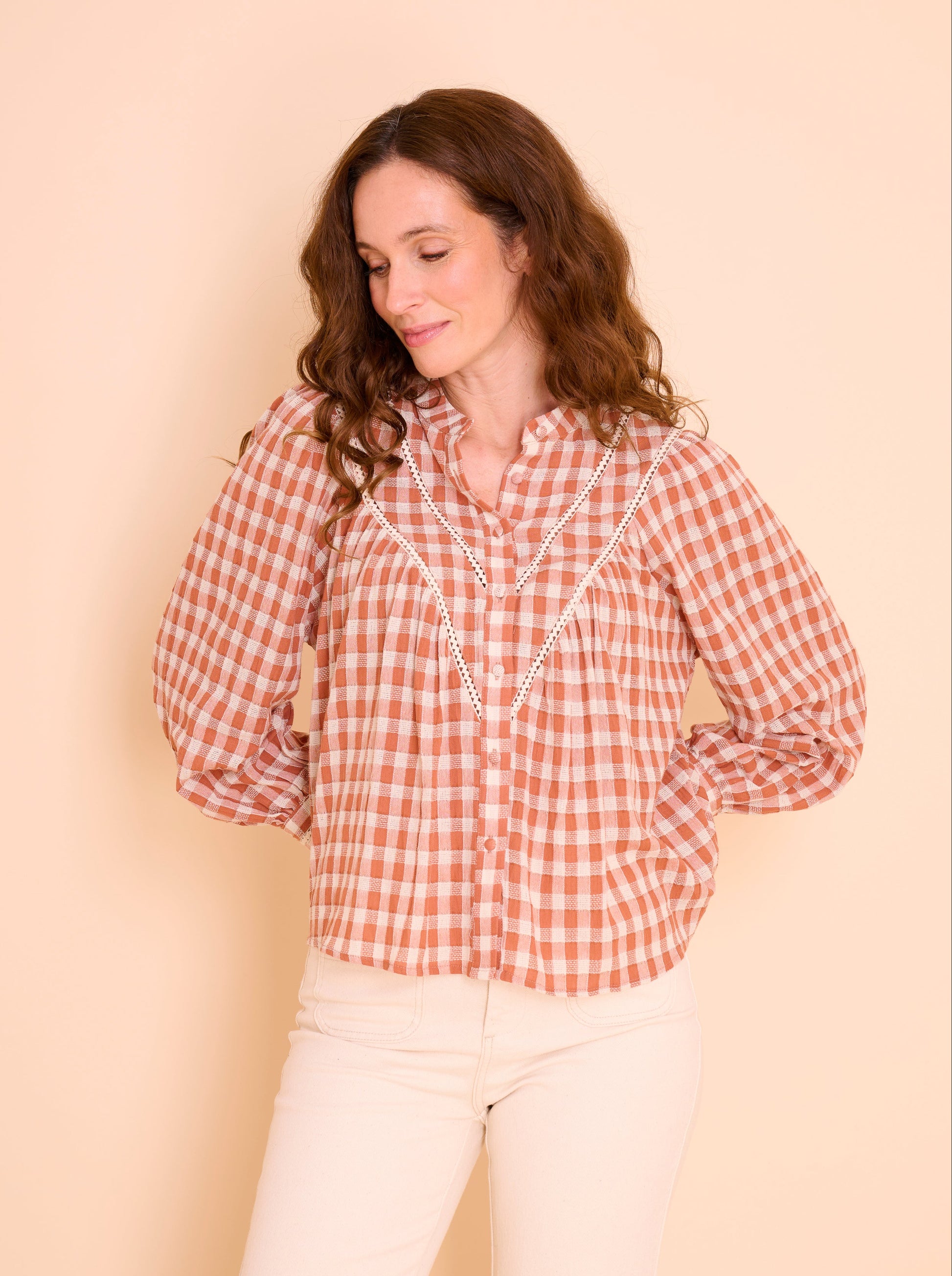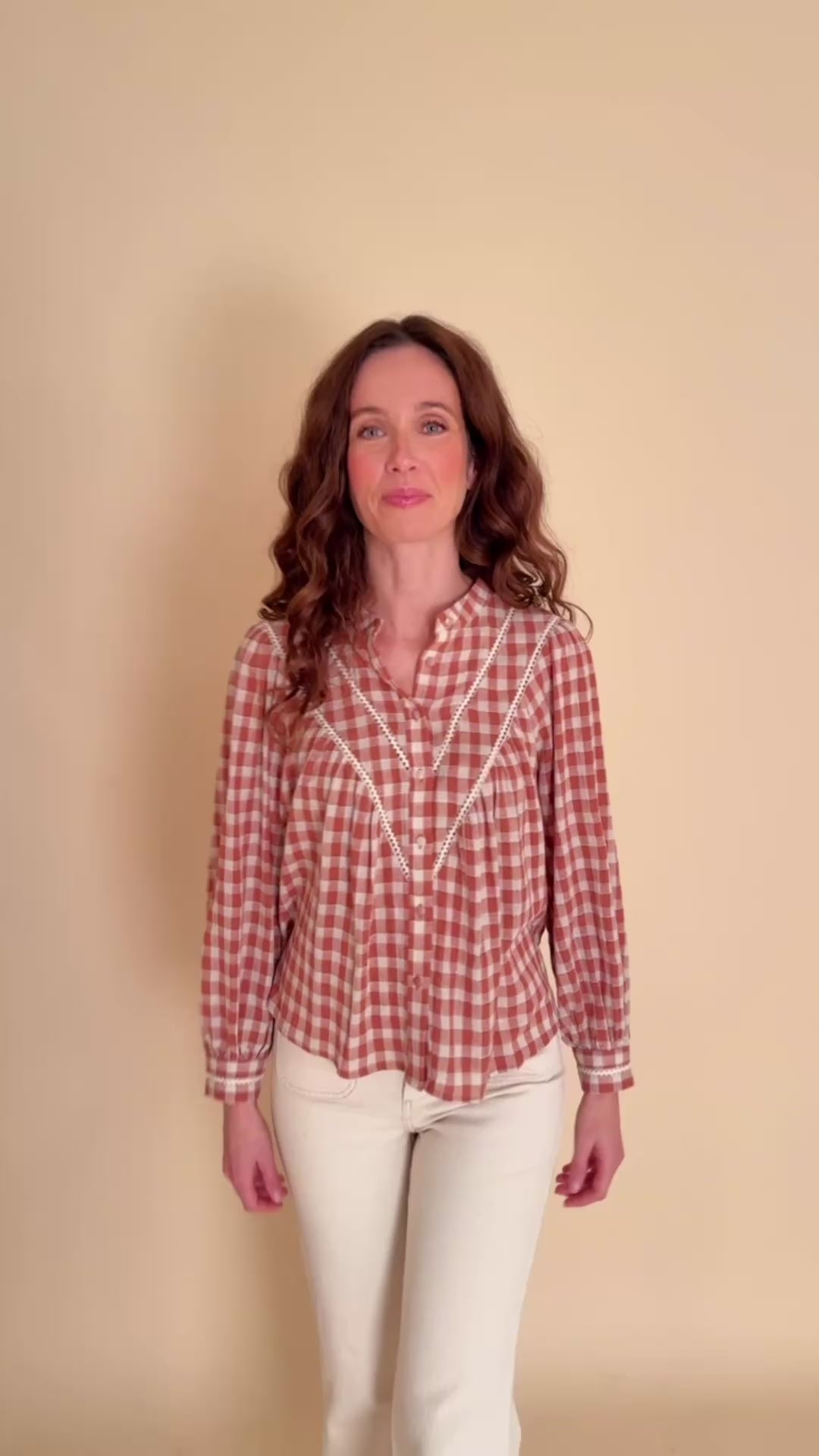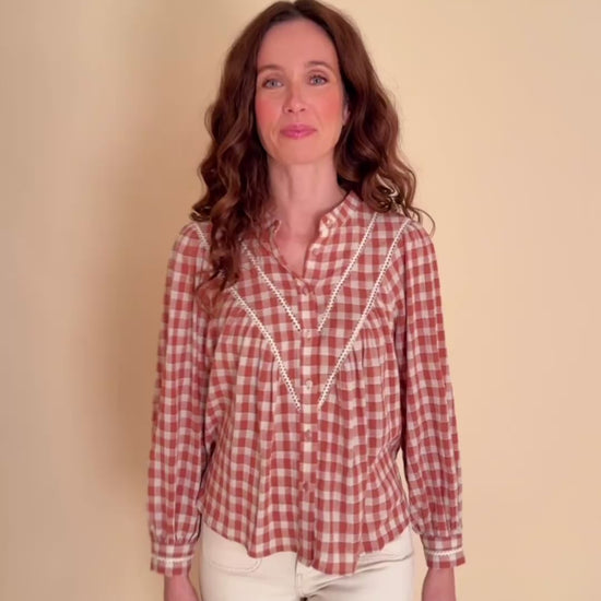 Un coup de cœur de la saison ! Son imprimé vichy terracotta, sa coupe fluide et ses détails de dentelle lui donnent un charme bohème irrésistible. Légère, douce et féminine, c’est la blouse parfaite pour illuminer vos looks du quotidien.
