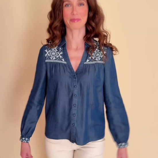 La blouse en jean légère qui va devenir votre basique cool de la saison. Fluide, confortable et twistée par ses broderies blanches dans le dos, elle apporte un style casual chic sans effort.