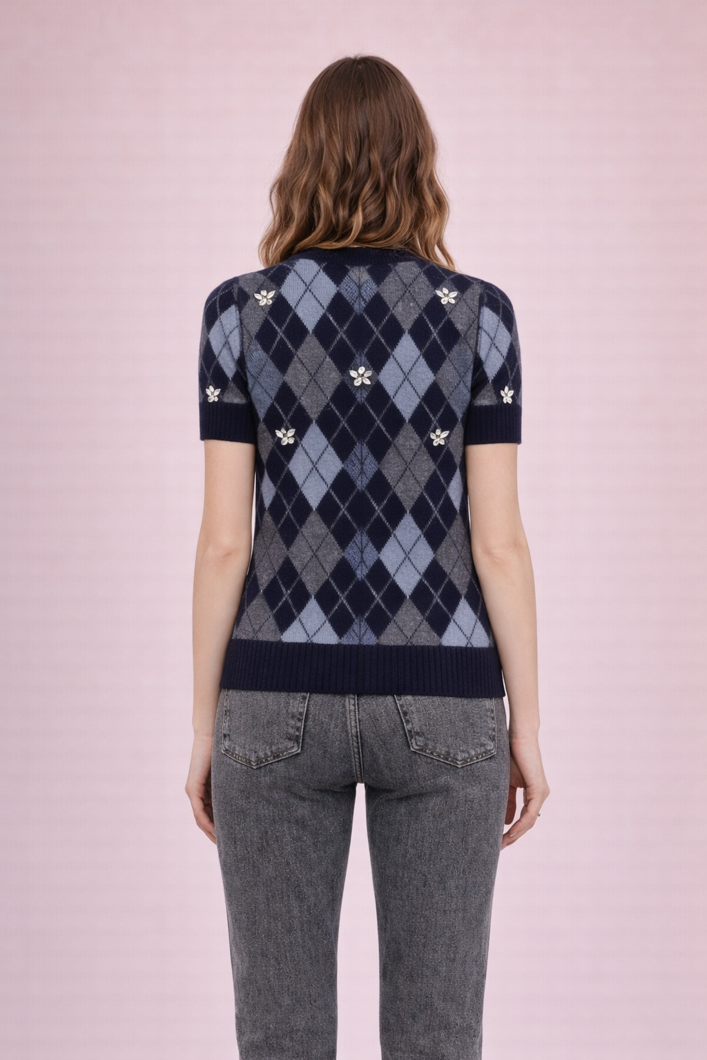 Un pull à l’allure chic et féminine qui revisite le motif losange avec modernité. On aime son jeu de couleurs marine et gris, à la fois élégant et facile à associer, et ses délicates perles bijoux qui apportent une touche précieuse sans en faire trop. Une pièce forte, idéale pour sublimer un look du quotidien.