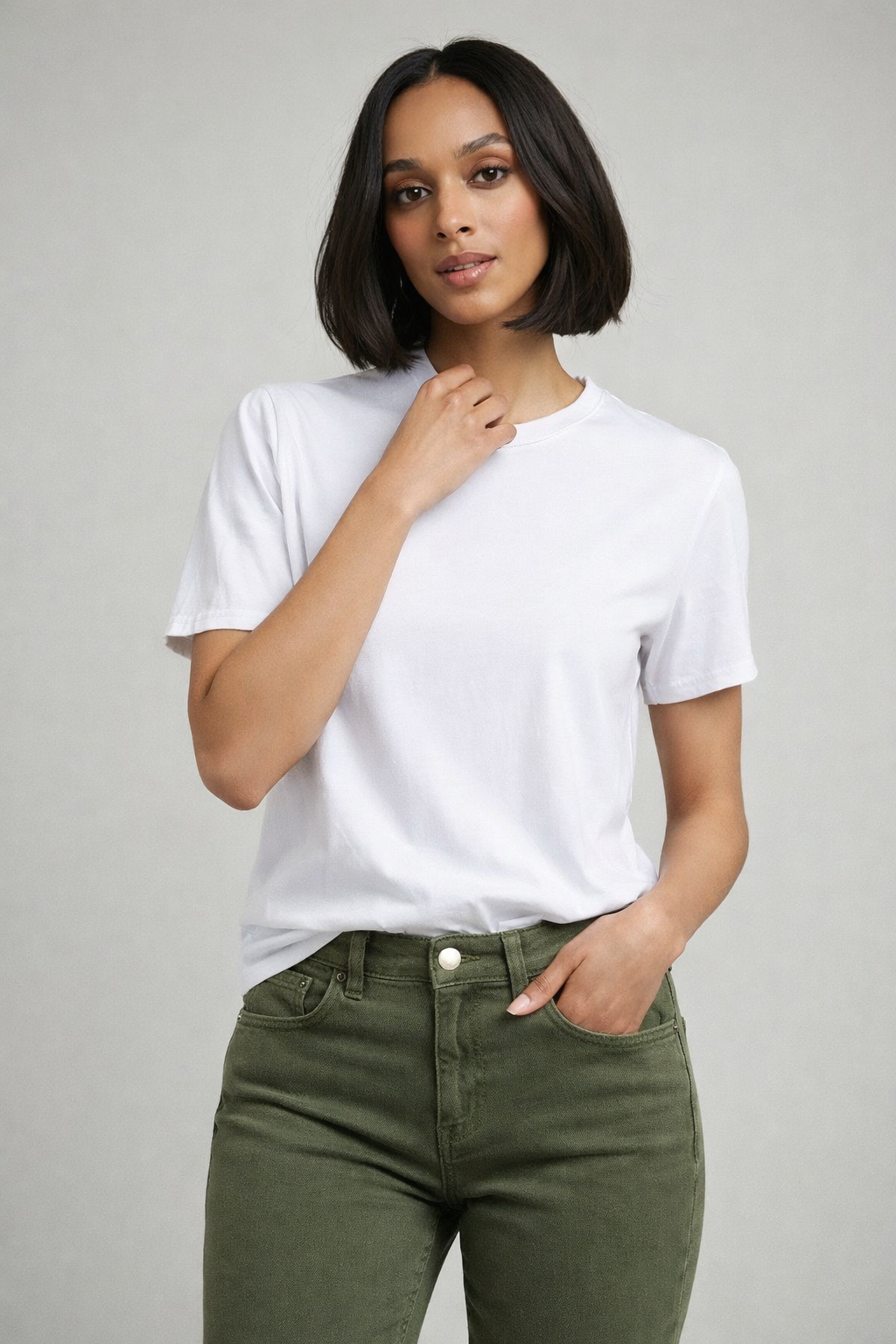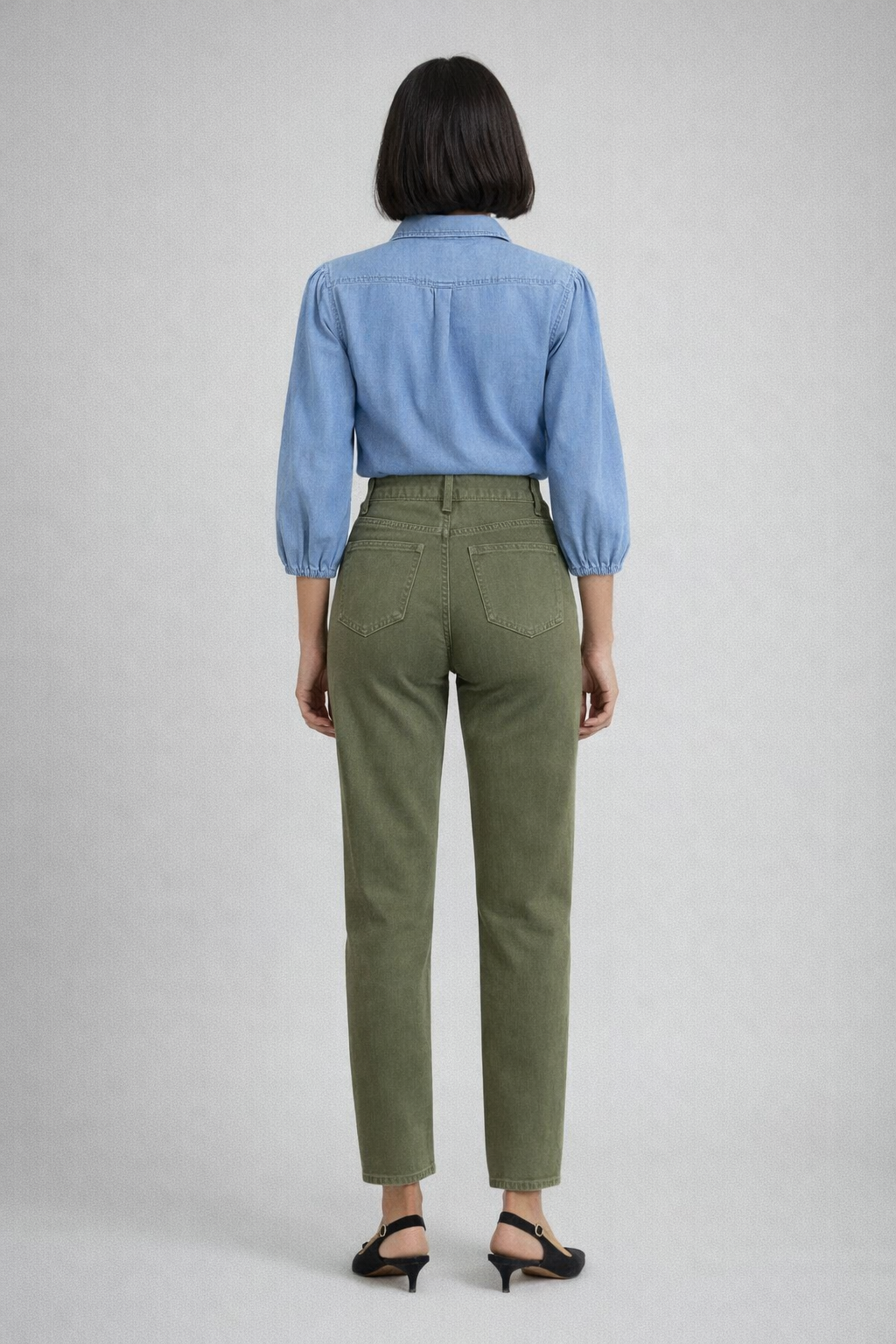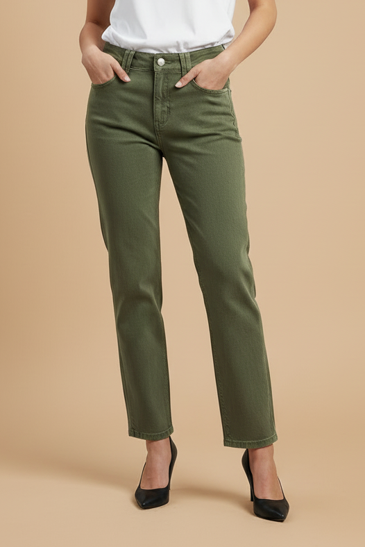 Un jean qui structure la silhouette tout en restant ultra confortable. Sa coupe droite et sa taille haute mettent en valeur la taille et allongent la jambe. Le kaki apporte une touche chic et facile à associer, parfait pour le quotidien comme pour une tenue plus habillée.