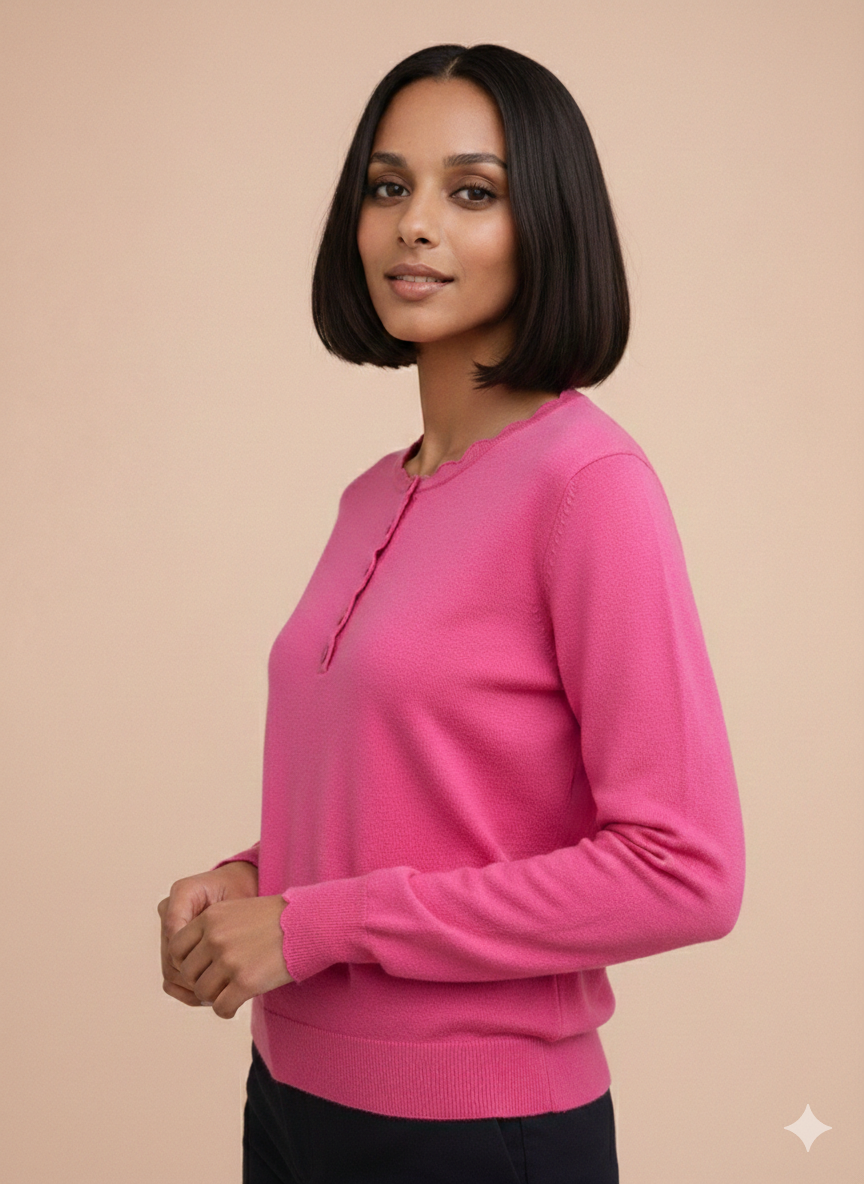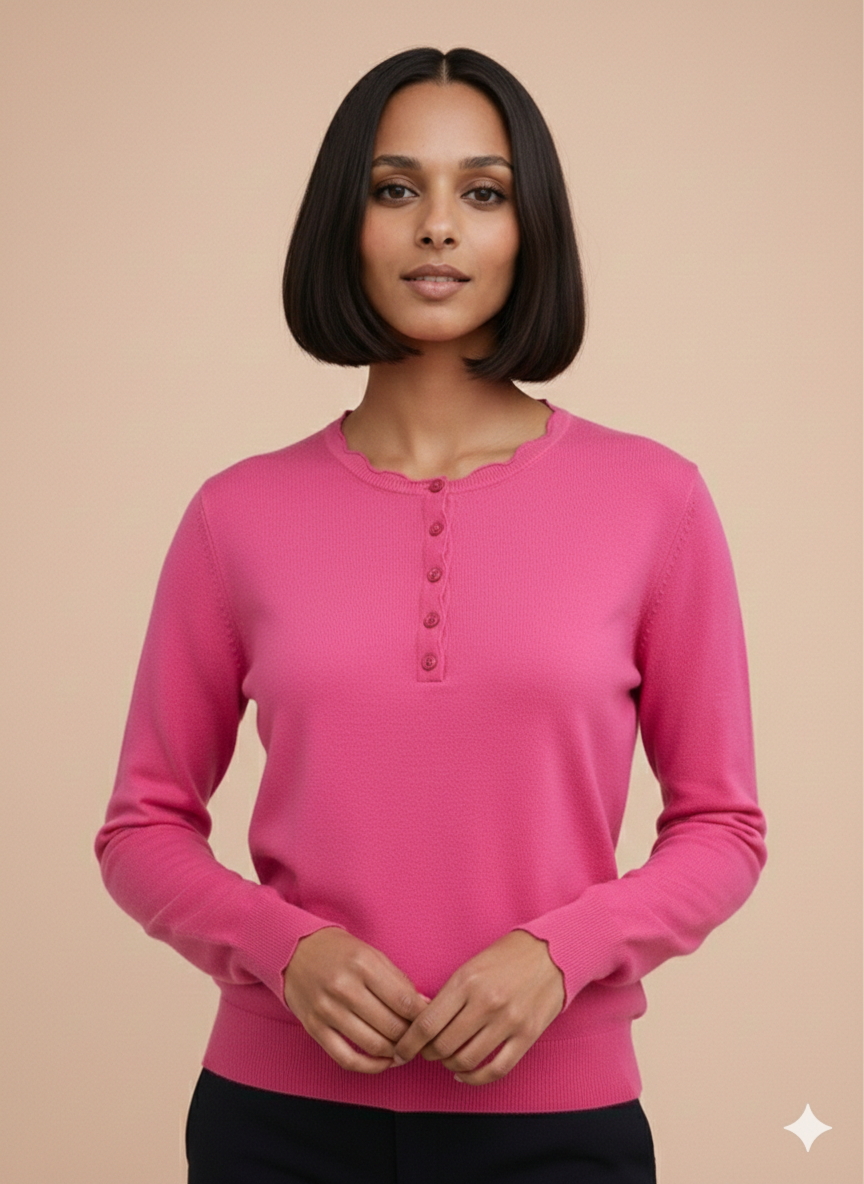 Le pull parfait pour ajouter une touche pop et féminine à votre dressing. Sa maille douce et légère se porte comme une seconde peau, tandis que les finitions festonnées au col et aux poignets donnent un twist moderne et délicat. Facile à associer, c’est la pièce coup de cœur qui réveille n’importe quelle tenue.