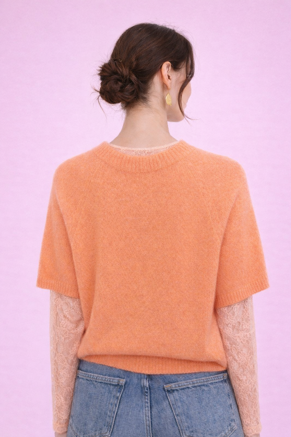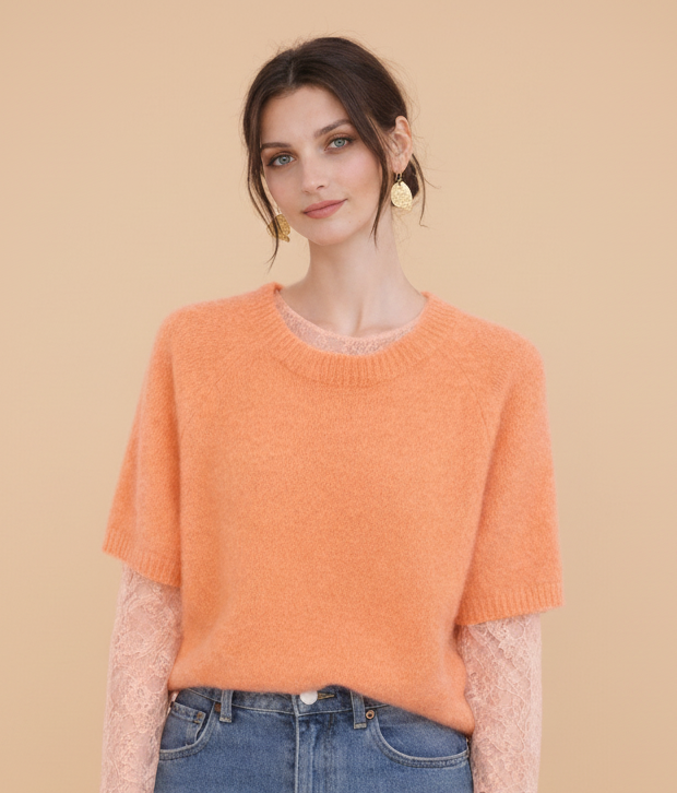 Un pull doux et lumineux à la couleur saumon qui apporte une touche chaleureuse et féminine à votre tenue. Sa maille moelleuse et ses manches courtes en font une pièce confortable et facile à porter au quotidien.