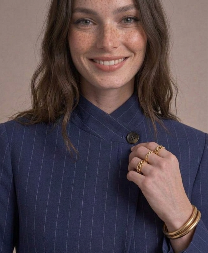 Élégant et résolument moderne, le blazer Divine Marine est la pièce parfaite pour structurer votre silhouette avec style. Sa coupe légèrement ajustée, son col croisé original et ses fines rayures apportent une touche sophistiquée et tendance. Facile à porter au quotidien comme en tenue plus habillée, il sublime aussi bien un jean qu’un pantalon tailleur.